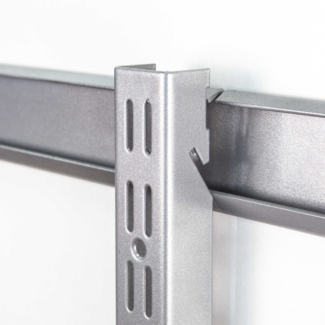 Вертикальная навесная направляющая. Каркас системы. Монтируется на стену, см. схему сборки. Служит основой навесных элементов системы хранения Gardie. Устанавливается как на несущий рельс, так и напрямую к стене. Направляющая имеет двойную перфорацию по всей длине для установки кронштейнов, полок и других элементов гардеробной системы Gardie. Изделие выполнено из стали толщиной 1,5мм.