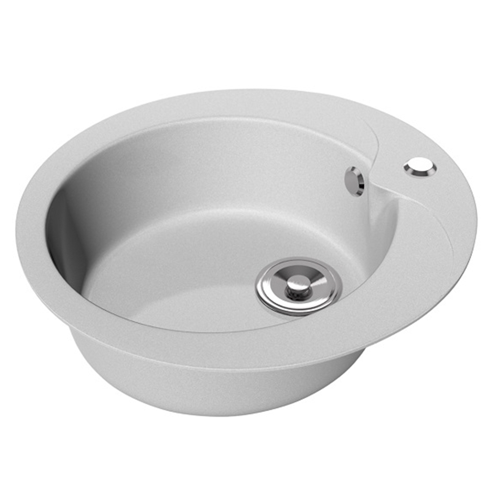 Каменная мойка диаметром 470 мм с круглой чашей диаметром 365 мм. Надкрылок каплевидной формы чуть выступает на чашу мойки. Высота мойки 180 мм, глубина чаши 165 мм. Вес модели 12,5 кг. Мойка представлена в гамме из 6 матовых и 8 глянцевых цветов.