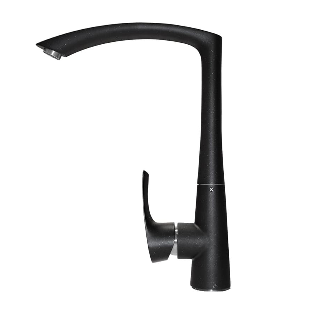 Кухонный смеситель из нержавеющей стали в черном покрытии с перламутром «Звездная ночь». Косообразный расширяющий к насадке аэратора излив и плавно переходящая в излив форма колбы придают модели стильный вид.